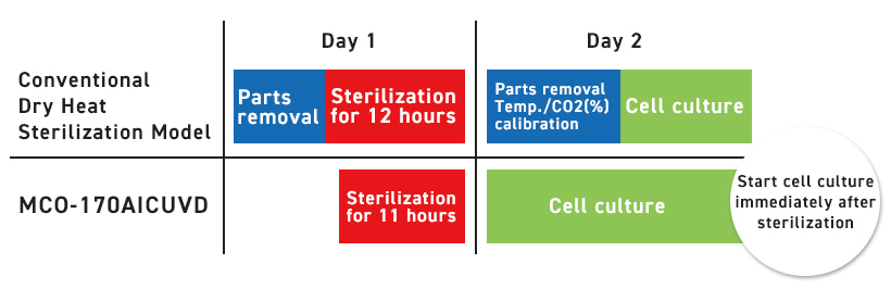 High speed sterilization systems utilizing hydrogen peroxide (H₂O₂), also used in latest regenerative medicine equipment, only takes approximately 135 minutes. Even taking account preparation time, the entire process takes approximately 2 and a half hours, aiding scientists in thoroughly sterilizing their equipment and reducing downtime at the same time.