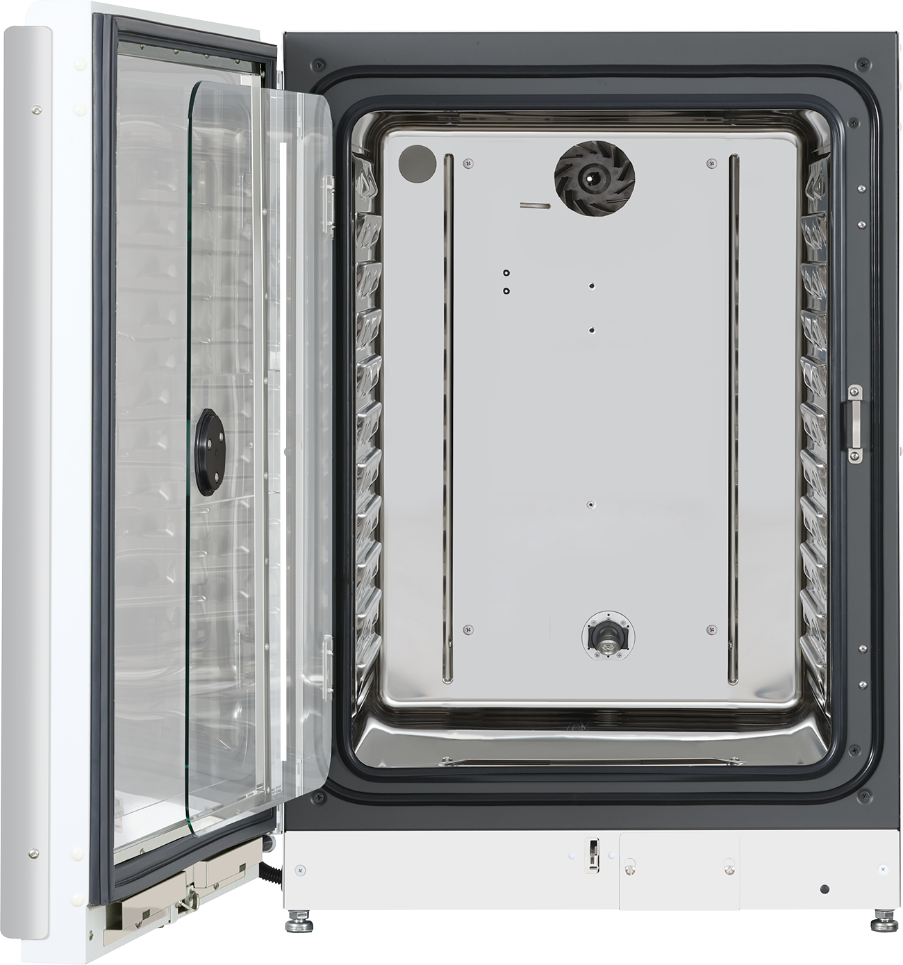 Fiberglass insulation minimises heat dissipation from the incubator. This allows one unit to be used for dry-heat sterilization while the other continues normal incubation when two incubators are stacked.