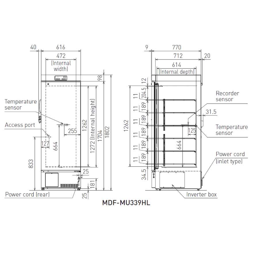 The new chassis plat form of MDF-MU339HL realizes the increased the storage volume for +95 liters (equivalent to +72 pcs 2 inch boxes) compared to the conventional ECO model MDF-MU300H.