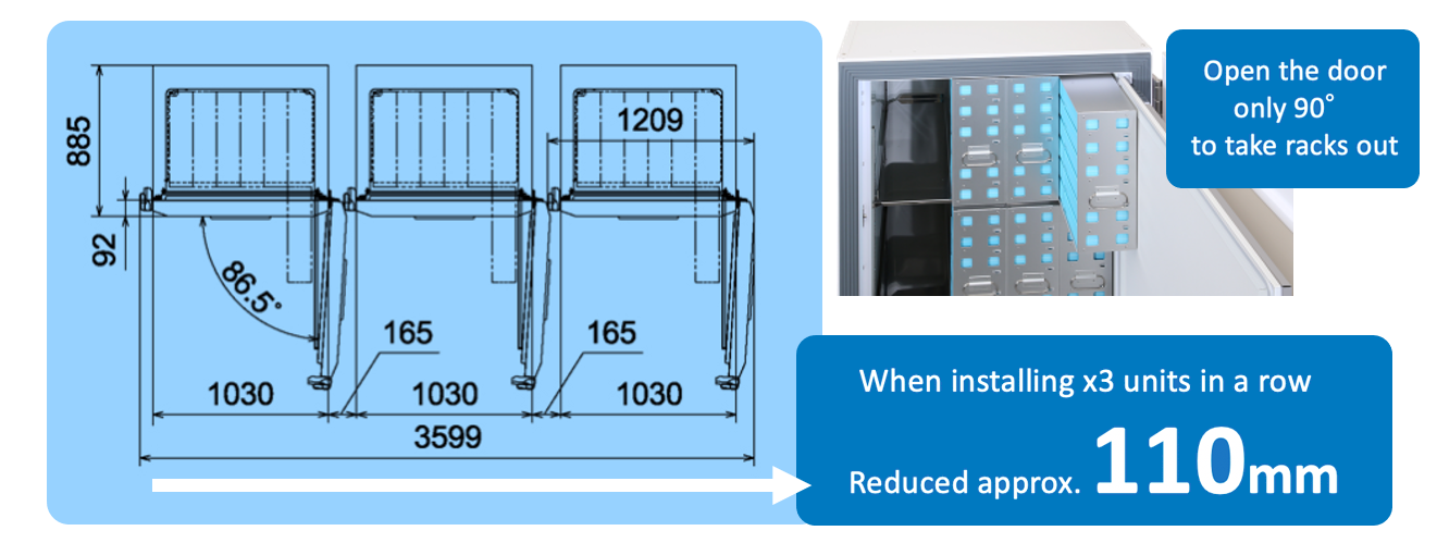 When installing multiple large-capacity ULT freezers, the units will occupy a significant amount of area, including the space required for the door to open and close. PHCbi's ULT freezer allows you to take out the rack inside the freezer, by opening the inner door to only 90 degrees. This makes it possible to reduce the overall width by approximately 110mm* when compared with conventional models, when 3 units are installed beside each other.
