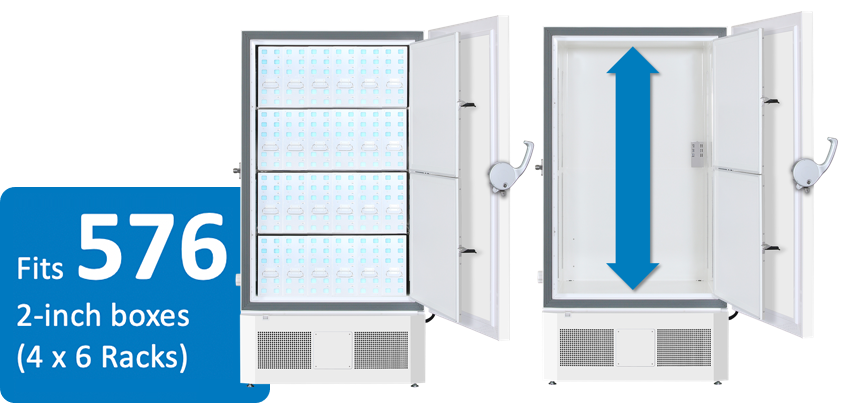 Would your current ULT freezer happen to have a center bar partition, and thus have limitations in changing the storage layout? Or is difficult to organize the racks? Or creates dead space? PHCbi's ULT freezer is layout-free without a center bar partition. The 700L model can store up to 576 2-inch boxes, which is a 10% increase when compared to conventional models.