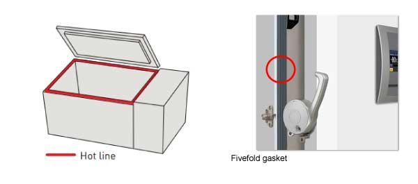 • Fivefold Gasket​ (VIP ECO, TwinGuard series): PHCbi developed the new gasket structure by the repeated testing comparing to the other ULT freezers available from market. Firm gasket structure with "Fivefold" air space increases insulation performance and prevents foreign material​ (ex. frost building up) comes in. It contributes to reduce the frequency of manual defrosting around the gasket for more conformable use.​