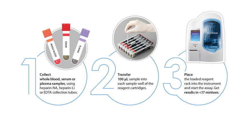 Dies verleiht PATHFAST™ seine einzigartige Geschwindigkeit bei bis zu sechs unterschiedlichen Markern oder einem einzigen Marker bei einem oder mehreren Patienten im selben Durchlauf. Er ist stets sicher und bietet die höchste Effizienz. Der Einsatz von Vollblut spart Zeit bis zum Erhalt der Ergebnisse, während sich der Patient immer noch am Point-of-Care befindet. Als Probenmaterial kann Vollblut eingesetzt werden, weshalb keine aufwendige Zentrifugenroutine erforderlich ist. Zudem können auch Plasma und Serum verwendet werden. Dank des einfachen und intuitiven Designs bietet PATHFAST™ einen einfachen Weg zur Analyse Ihrer Patientenprobe anhand von drei einfachen Schritten.