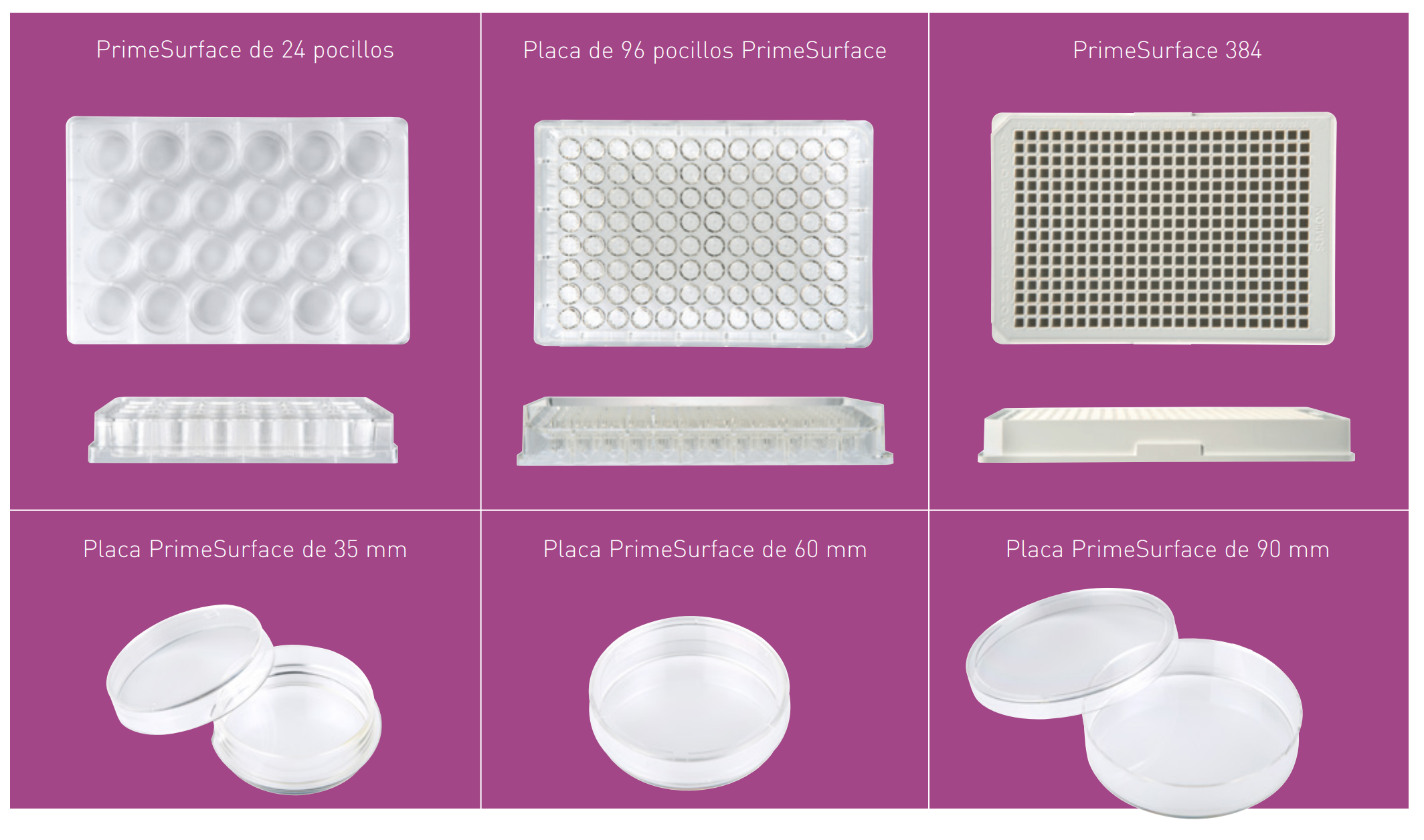 Los instrumentos de laboratorio PrimeSurface son placas y placas de cultivo celular con pocillos de adherencia ultrabaja (ULA) que promueven la formación de esferoides sin andamios y autoensamblada. Las placas están prerrecubiertas con un exclusivo polímero ultrahidrófilo que permite la formación espontánea de esferoides de tamaño y forma uniformes. Las placas ULA tienen una gran claridad óptica, por lo que son aptas para la adquisición de imágenes de campo claro y microscopia confocal. Además de las placas ampliamente utilizadas de 96 pocillos con fondo en U, también hay disponibles placas de 96 pocillos con fondos en V y en M, con lo cual los científicos pueden optar por formar esferoides más compactos, necesarios para tipos específicos de células. También hay disponibles placas de 384 pocillos de color transparente y blanco para las necesidades relacionadas con el cribado analítico de gran capacidad (HTS).