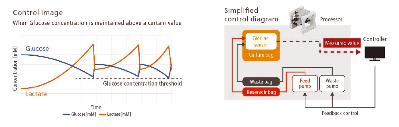 The Real-time Wave-mixing Bioreactor measures the concentrations of glucose and lactate in real-time and automatically replaces the culture medium based on the measured values. An optimal and stable supply of glucose is guaranteed and exposure to elevated levels of lactate is avoided.