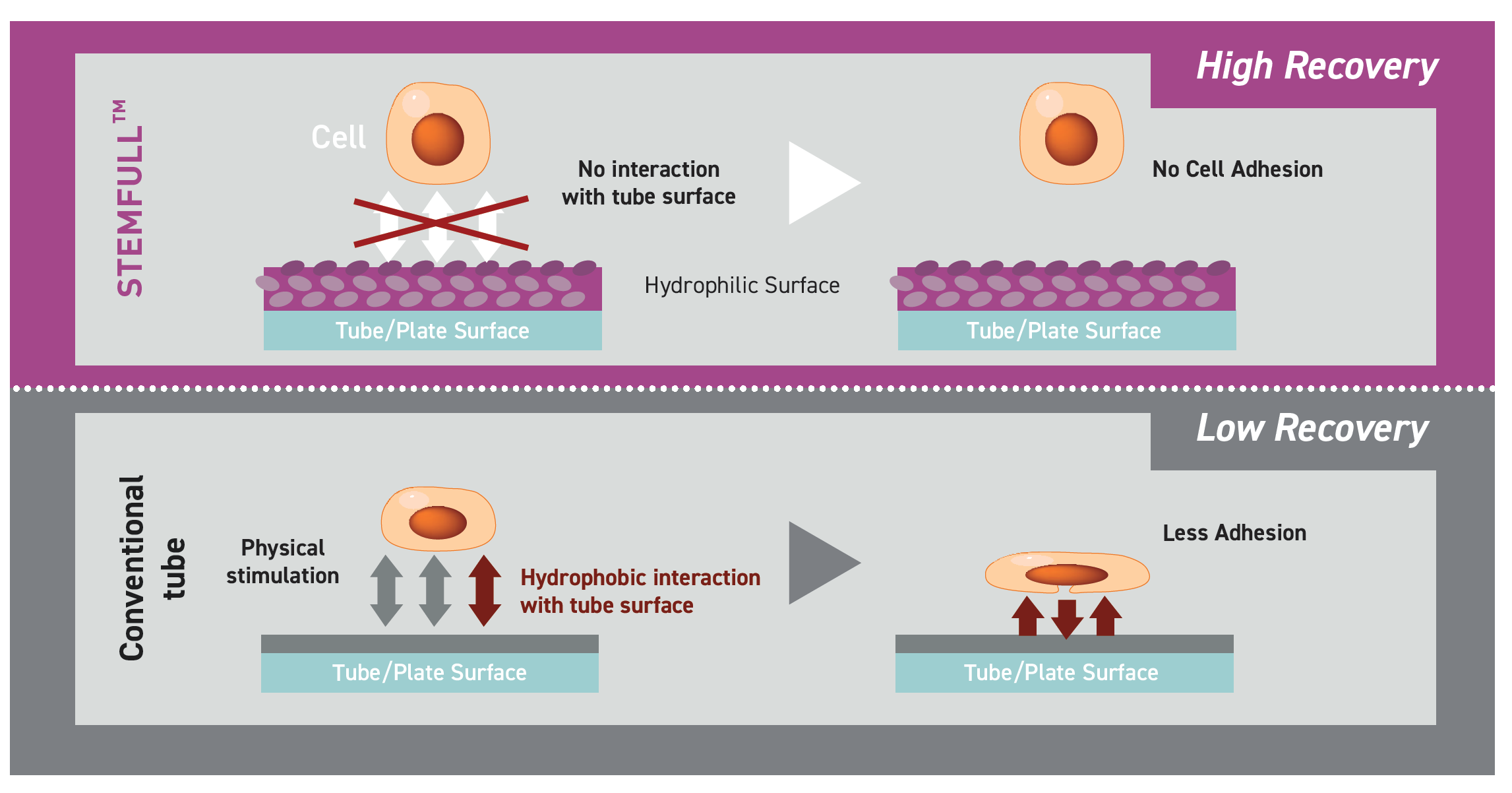 The STEMFULL™ tube has a unique, covalent bound Ultra- Hydrophilic polymer coating to prevent non-specific binding of cells to the tube.