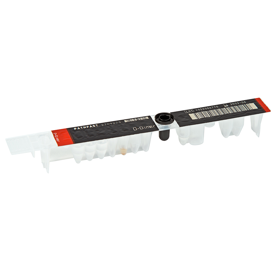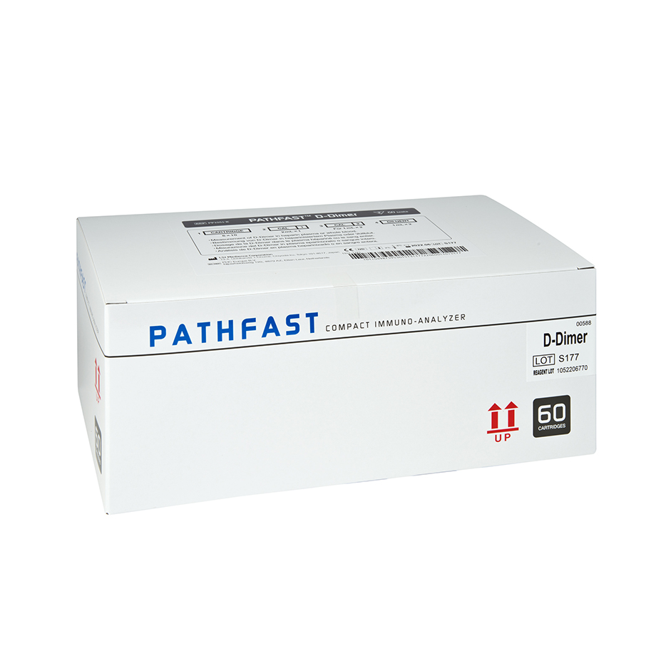 PATHFAST™ D-Dimer is a chemiluminescent enzyme immunoassay for the quantitative measurement of D-Dimer concentration in whole blood or plasma. PATHFAST™ D-Dimer is used an aid in the diagnosis of activation processes of the coagulation system including deep vein thrombosis (DVT) and pulmonary embolism (PE). Plasmin-induced lysis of crosslinked fibrin results in the formation of D-dimer containing fibrin degradation fragments (XDP). D-dimer is a specific marker of the degradation of factor XIIIa- crosslinked fibrin and an indirect early marker of activation of coagulation and clot formation. The plasma concentration of D-dimer is elevated in clinical conditions associated with activation processes of the coagulation system including DVT, PE, and DIC. The exclusion of DVT or PE in patients suspicious for venous thromboembolism is possible if the D-dimer concentration is below the cut off value established by numerous clinical studies. D-dimer measurement is also usable as an aid in diagnosis and monitoring of DIC