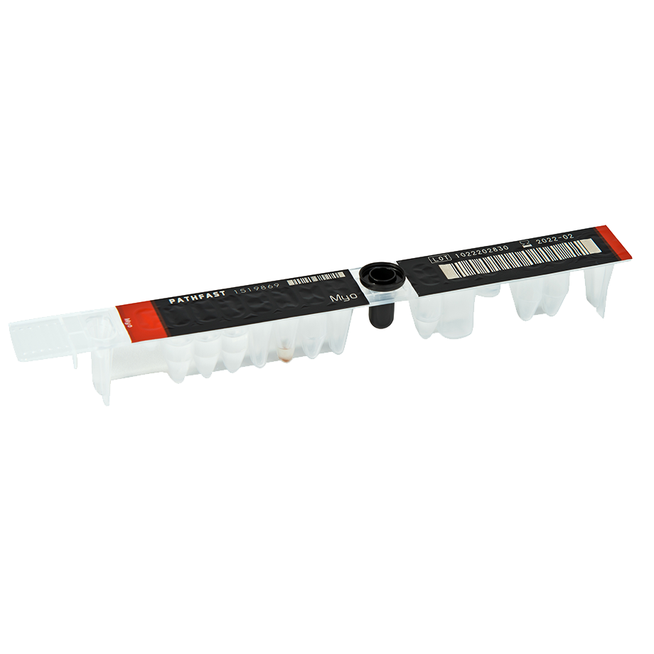 PATHFAST™ Myo is a product for in vitro diagnostic use with the in vitro diagnostic system PATHFAST™ for the quantitative measurement of Myoglobin in heparinized whole blood and plasma. The result obtained with the assay is used to assist in the diagnosis and especially in the exclusion of acute myocardial infarction. Myoglobin (Myo) is a low molecular weight, heme-protein found in both cardiac and skeletal muscle. Following myocardial necrosis associated with acute myocardial infarction (AMI), myoglobin is one of the first markers to rise above normal levels, increasing measurably above baseline within 1-3 hours post infarction, peaking at 6-12 hours and returning to baseline within 24-36 hours. In the absence of skeletal muscle trauma or other situations associated with a non cardiac related increase in circulating myoglobin (e.g. renal failure), measurement of myoglobin in blood has been used as an early marker of AMI. Several studies proved that the measurement of myoglobin can be used as a rapid and sensitive test in the early phase of AMI for its diagnosis in conjunction with the ECG and for exclusion of myocardial infarction in patients presenting with acute chest pain, especially after a further negative test one hour later.