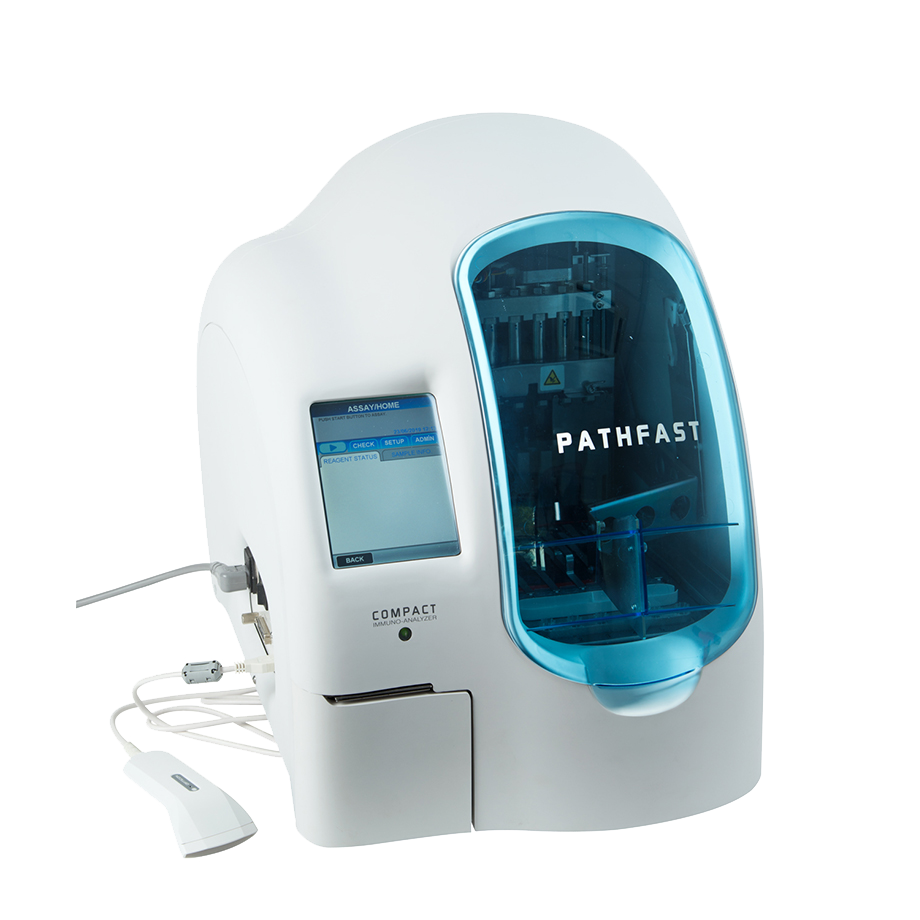 The PATHFAST™ system combines the accuracy of a full-scale lab analyzer with the flexibility of a mobile solution. Its compact design and low weight makes PATHFAST™ the ideal analysis system in laboratories, hospitals and medical offices available wherever fast quantitative results (with full-scale lab quality) are required at the point of care. With its space-saving design and large degree of flexibility PATHFAST™ is also an ideal supplement or back-up system in central labs. It can be available at any time (24 hrs per day) without interfering with the processes of routine analysis.