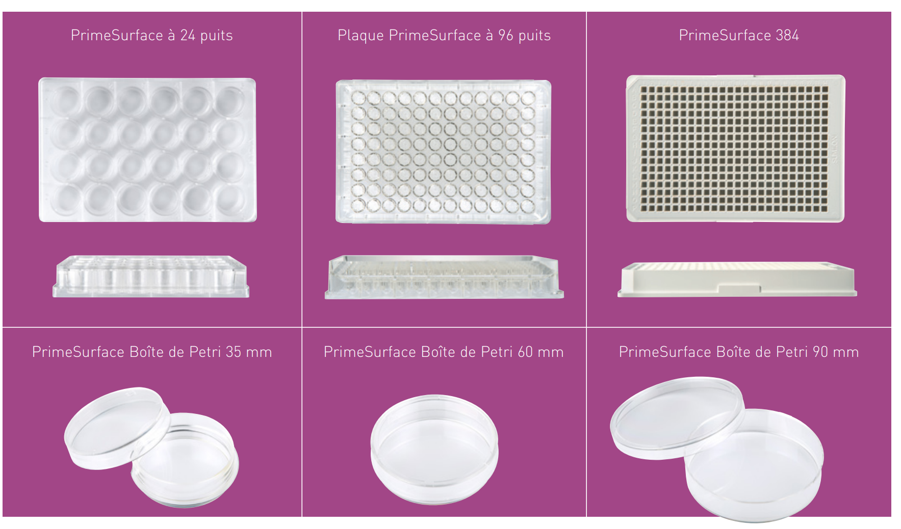 Les instruments de laboratoire de culture cellulaire PrimeSurface sont des plaques et des boîtes à très faible adhérence (ULA) qui favorisent l’auto-assemblage sans matrice des sphéroïdes. Les plaques sont pré-revêtues d’un polymère unique ultra-hydrophile, qui permet la formation spontanée de sphéroïdes de tailles et de formes uniformes. Les plaques ULA offrent une clarté optique élevée, ce qui fait qu’elles sont adaptées à une imagerie en fond clair et à la microscopie confocale. En plus de la plaque à 96 puits à fonds en forme de U largement utilisée, les plaques à 96 puits sont également disponibles avec des fonds en forme de V et en forme de M, ce qui donne aux scientifiques le choix de pouvoir former des sphéroïdes plus fermes, nécessaires pour certains types de cellules spécifiques. Pour les besoins du criblage à haut-débit (HTS), des plaque à 384 puits transparentes et blanches sont disponibles.