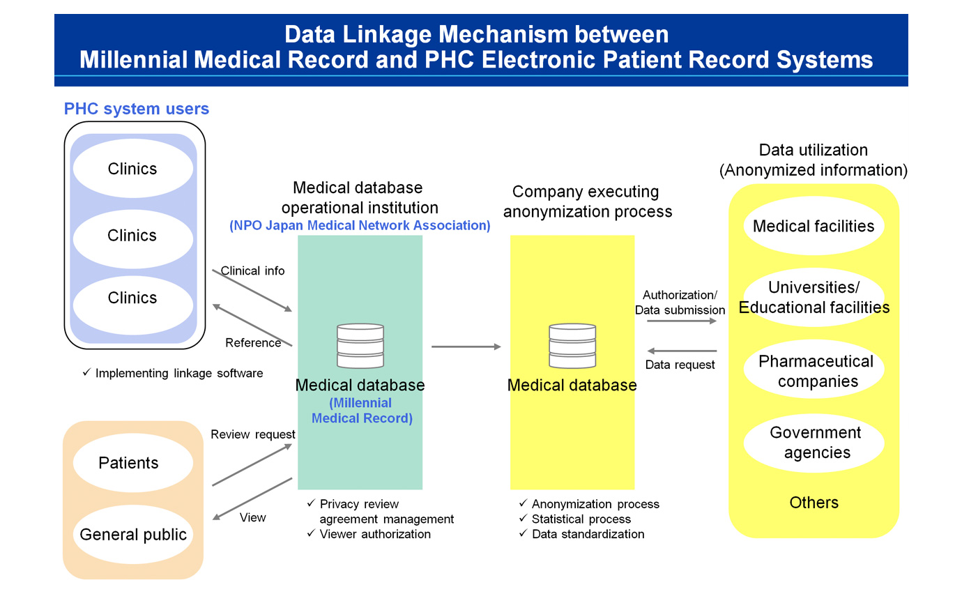 The Next Generation Medical Infrastructure Act*2 that went into effect May 11 defines anonymization of patient health records provided by medical institutions in order that research organizations such as universities and healthcare companies are able to utilize the data for the development of drugs and medical equipment as well as in large-scale research projects regarding the efficacy and evaluation of various products. In the experiments covered by the agreement, PHC links data stored in electronic patient record systems with the Millennial Medical Record database. This is conducted after healthcare institutions are invited to participate and obtaining patient consent. The experiment will confirm the appropriate secondary use of medical data according to the law as well as aiming to allow patients across the country to access the data in a safe manner.