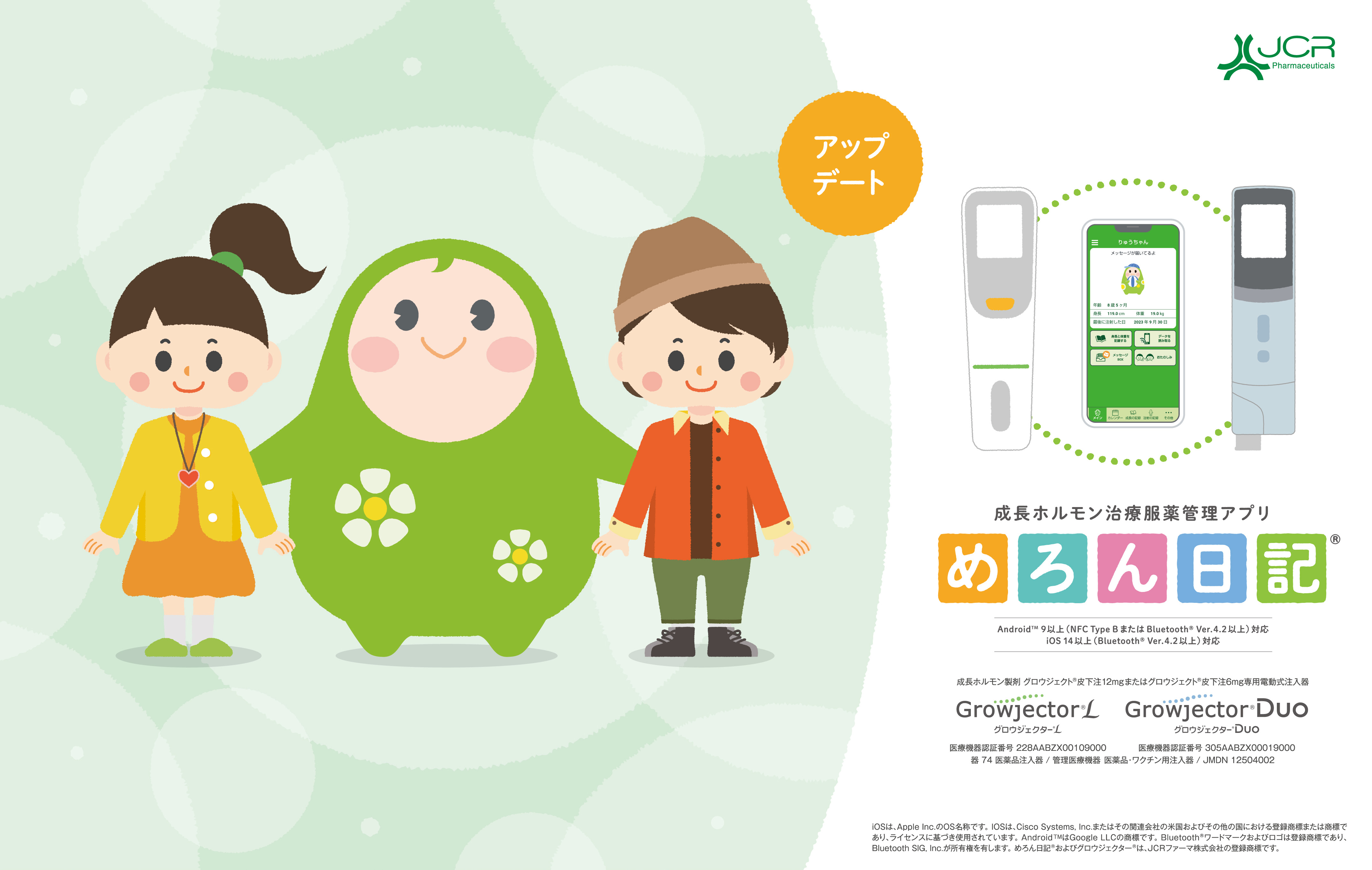 Toru Ashida, Senior Vice President and Executive Director of the Sales Division at JCR, said, “We are dedicated to engaging in research and development to meet the needs of patients undergoing human growth hormone treatment using the GROWJECTOR® series and Melon NikkiTM. We are excited for this app update to improve the treatment experience for patients and healthcare providers. We are also looking forward to this app contributing to further possibilities in the digital transformation of healthcare. Our continuous focus is on offering a wide range of treatment options for growth disorders and contributing to pediatric medicine."
