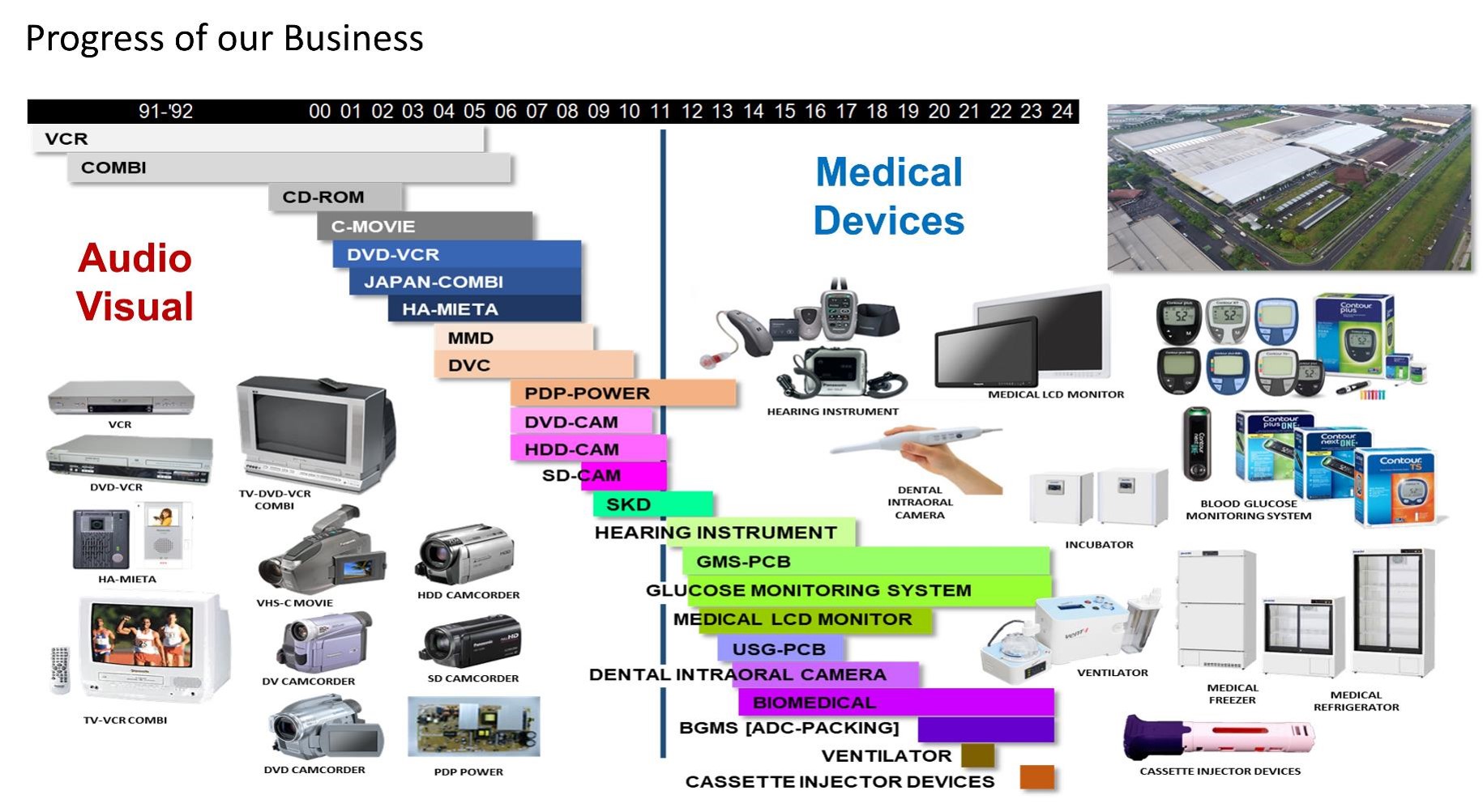 We start our business from 1991 by producing Audio Visual Devices. Various types of audio visual devices such as VCR, COMBI, CD-ROM, DVD, CAMCODER, and SKD was produced from 1991 until 2011.