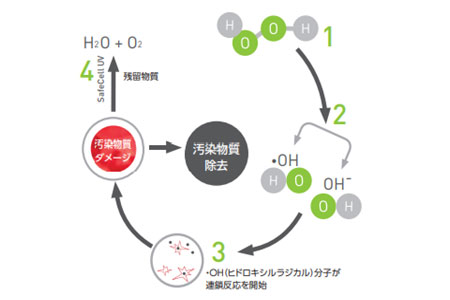 1. 過酸化水素を超音波振動子でミスト化し器内に噴射。除染プロセス中は、送風モーターが稼働し続け、ミスト化した過酸化水素が器内の隅々まで到達します。 2. ミスト化した過酸化水素は、器内で・OH(ヒドロキシルラジカル)分子とOH-(水素化物イオン)に分解されます。 3. ・OH(ヒドロキシルラジカル)分子が、汚染物質から電子を奪う連鎖反応を起こし、汚染物質を除去します。 4. UV殺菌システムが稼働し、除染後の残留物質は、水(H₂O)と酸素(CO₂)に分解されます。
