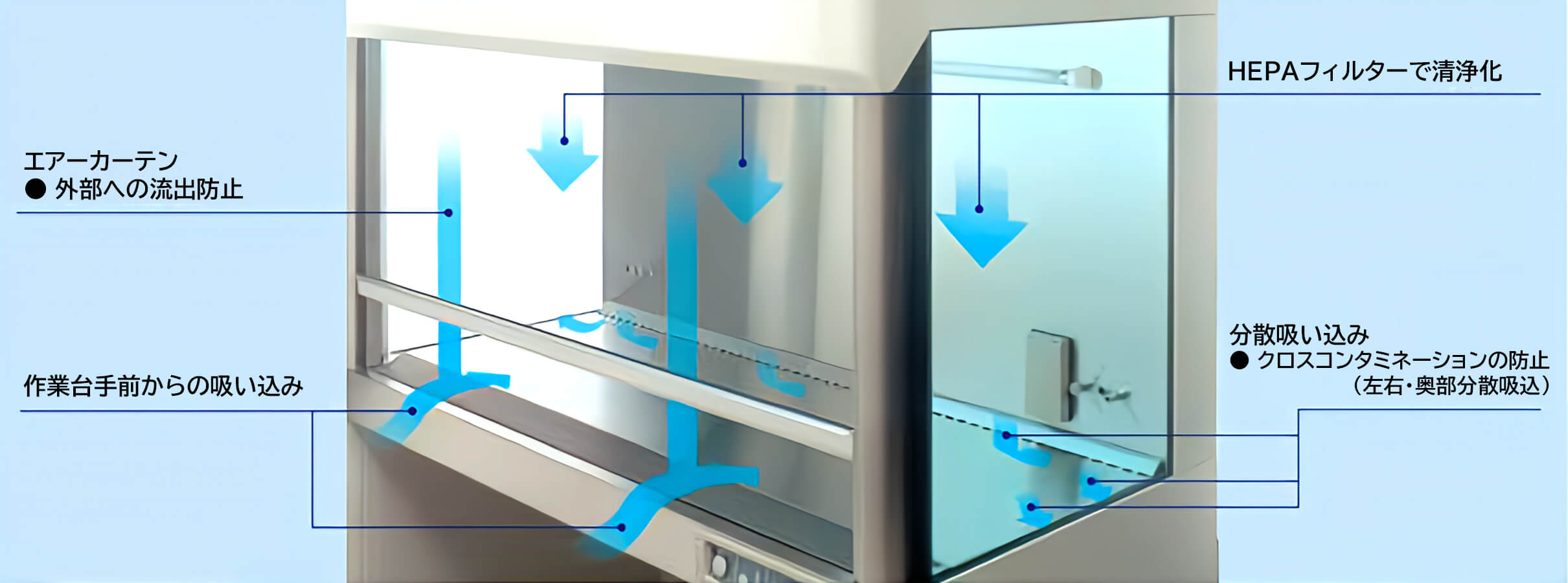 ワークエリアの開口部には、エアーカーテンを装備しています。汚染空気を包み込んで吸込口へ導き、操作側への直接流出を防ぎます。