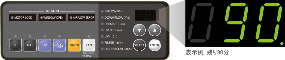 デジタル表示:風速・排気フィルター差圧・殺菌灯タイマー設定時間・殺菌灯積算時間・フィルター運転積算時間・蛍光灯積算時間