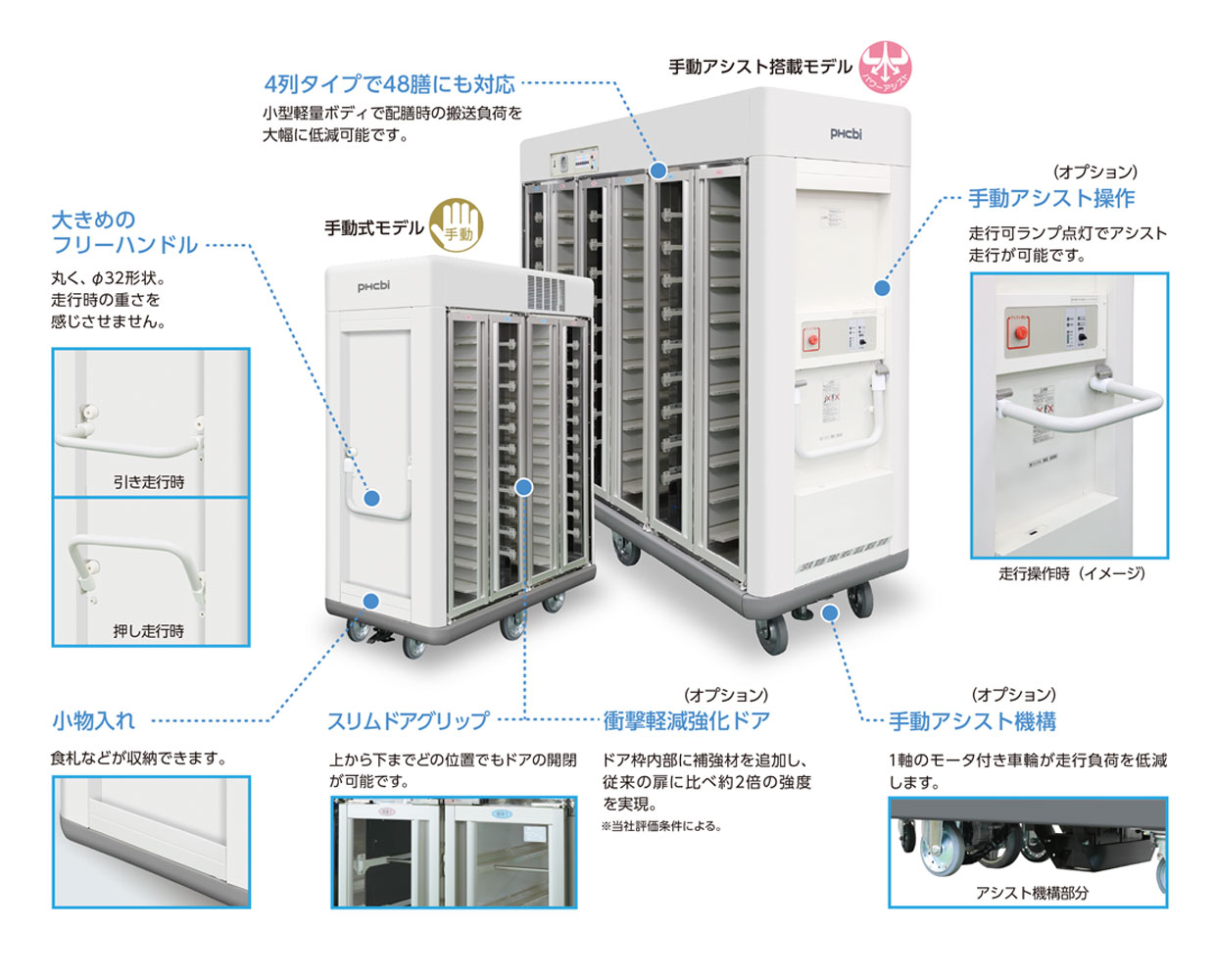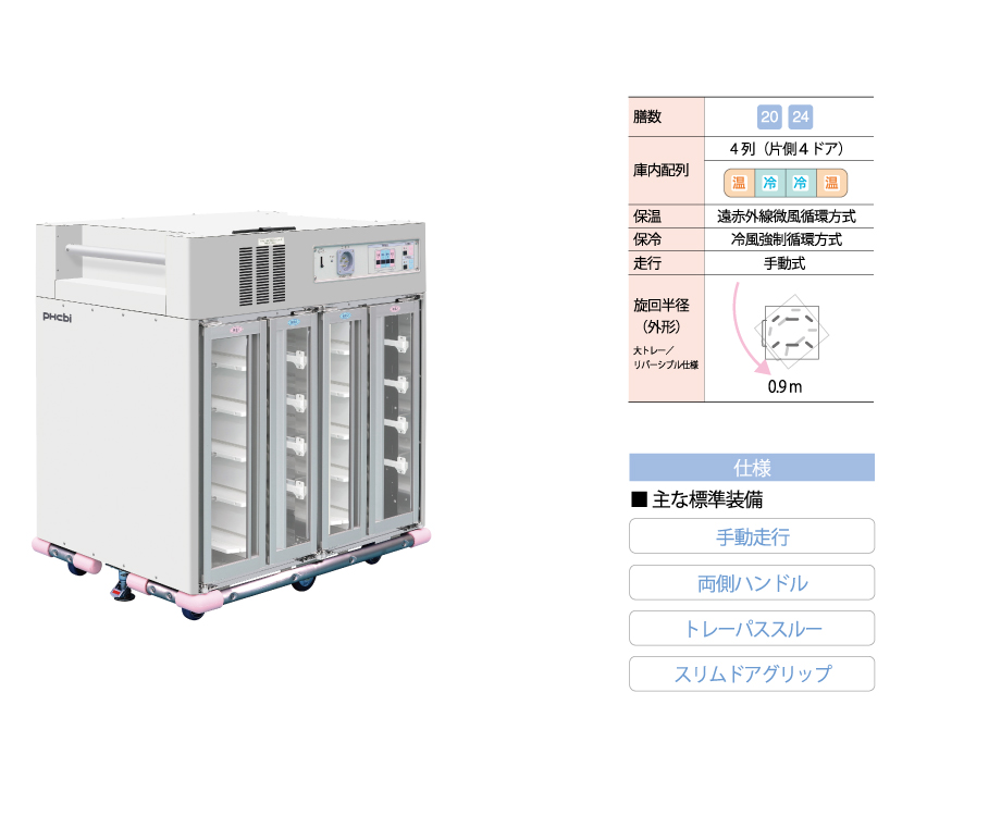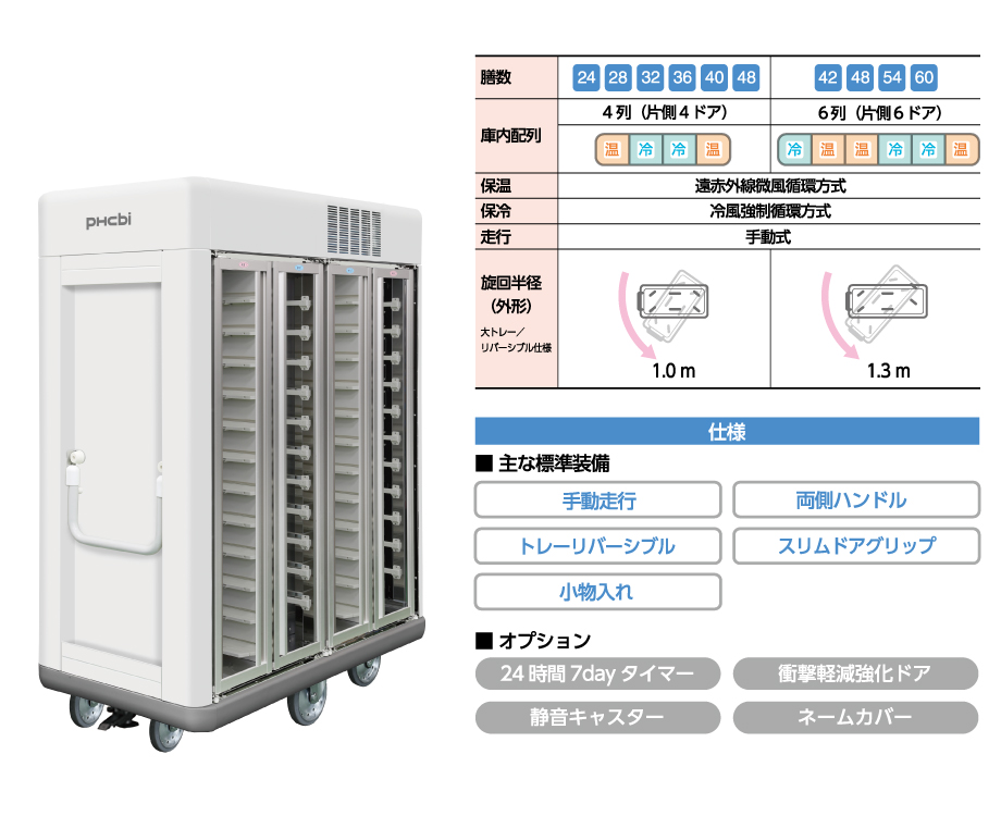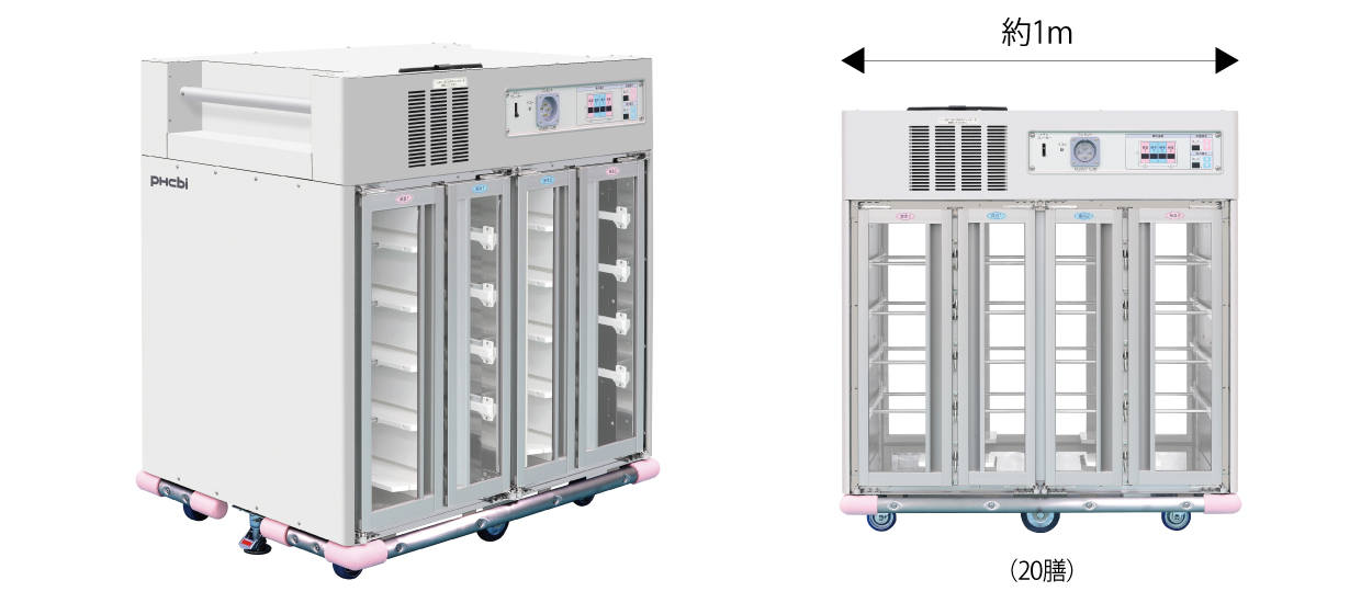 全長約1m。業務用小型エレベータに積載できる手動式デリカート。20膳と24膳をラインアップしています。