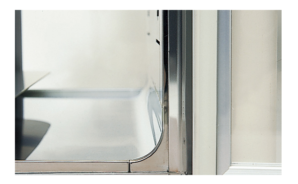 ドア枠と窓部の段差が少ない形状のため、手摺りなどがひっかかりにくくなりました。ドア枠内部に補強材を追加し、従来の扉に比べ約2倍の強度を実現。