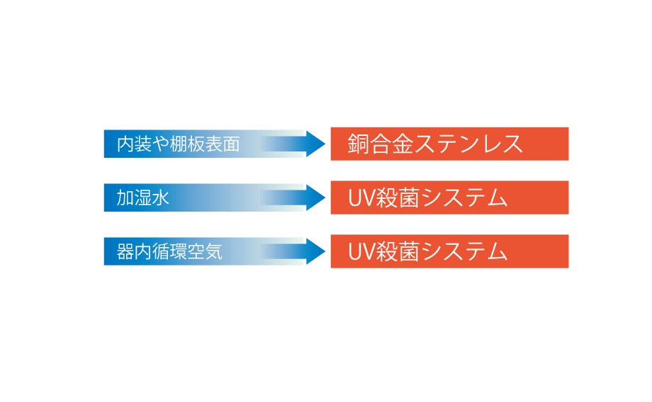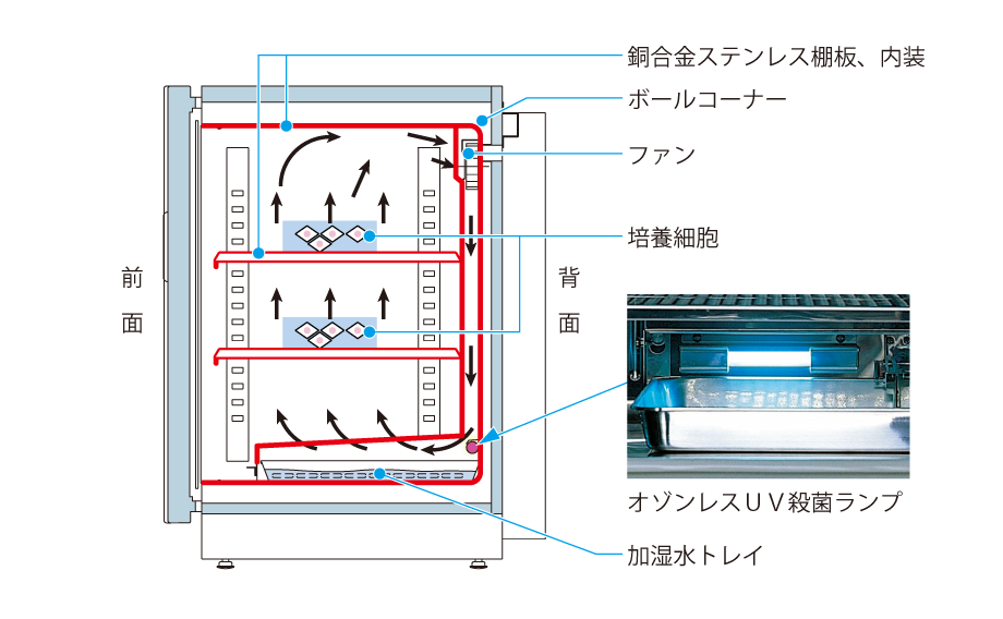 内装には、抗菌性能と耐腐食性に優れた銅合金ステンレスを採用。銅の高い抗菌作用とステンレスと同等の耐腐食性を兼ね備えています。また、培養物への悪影響もありません。