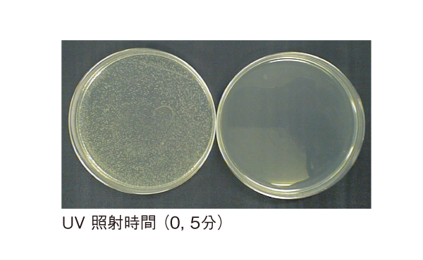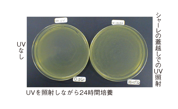 (シャーレ・培養フラスコの材料であるポリスチロールは50mmの厚さでUVを100%遮断します。右の写真はシャーレの蓋がUVを遮断し菌の増殖を妨げないことを示します)