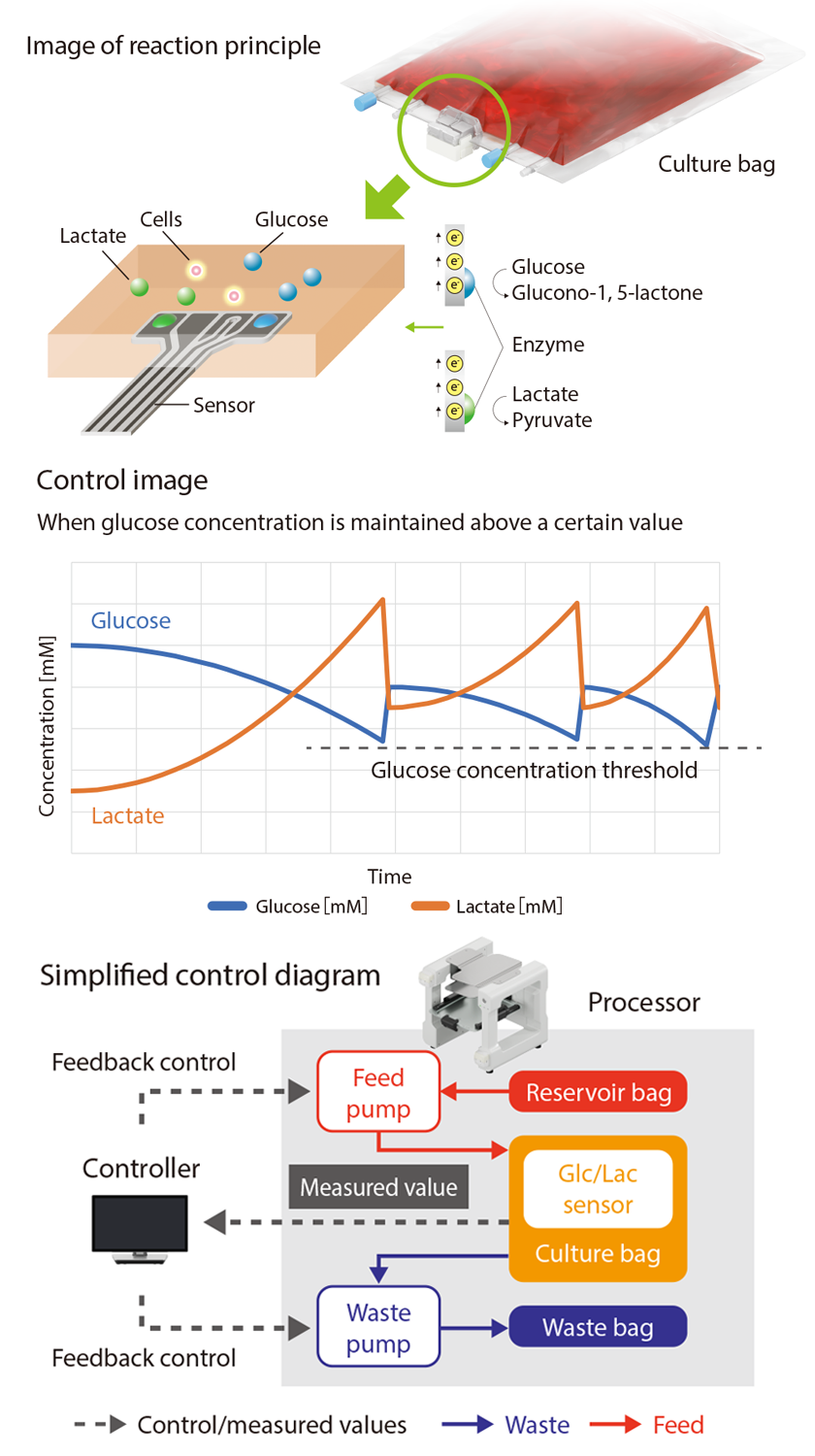 Cell state visualization through continuous changes in glucose and lactate concentrations Optimal culture conditions maintained through automatic culture control,contributing to enhanced cell quality