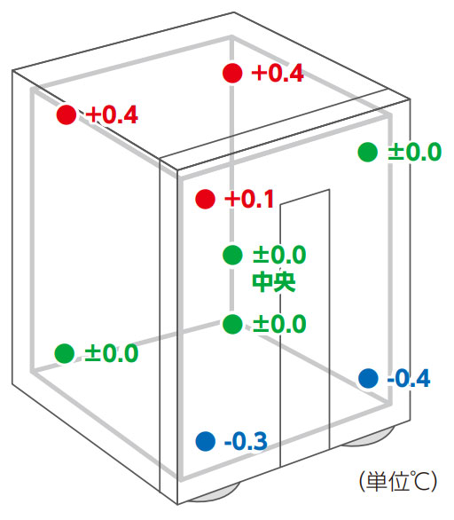 周囲温度25℃、庫内設定温度35℃における庫内中央を基準とした温度分布(無負荷時)