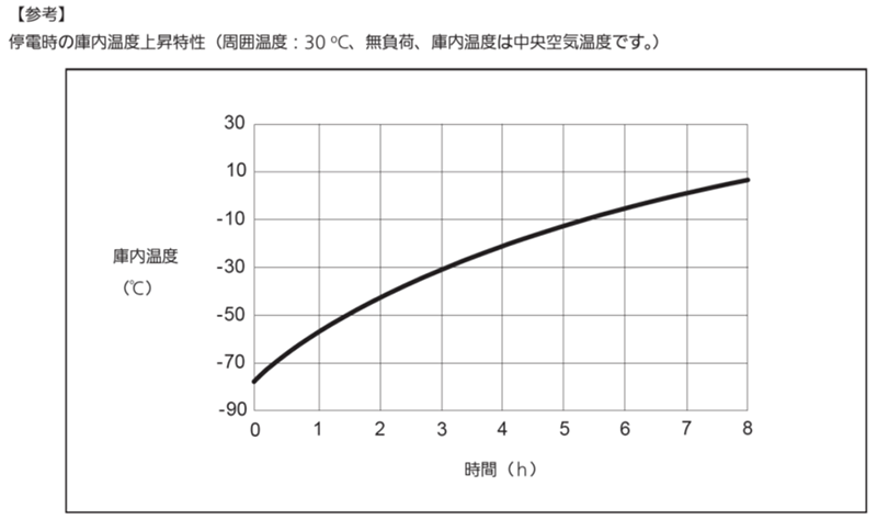 短時間の停電では内容物の温度上昇はわずかですが、停電が数時間に及ぶ場合はドライアイスや補助冷却装置