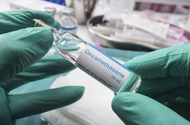 酸素吸入が必要な入院患者の場合、対処法は大きく変わります。この段階の患者には、レムデシビルとステロイド系抗炎症薬のデキサメタゾンのどちらか、または両方が投与されます[6]。デキサメタゾンは、長年の使用により有効性と安全性が確認されていますが、副作用が無いということではなく、投与により特に、耐糖能・被刺激性・食欲が変化する可能性があります[7]。