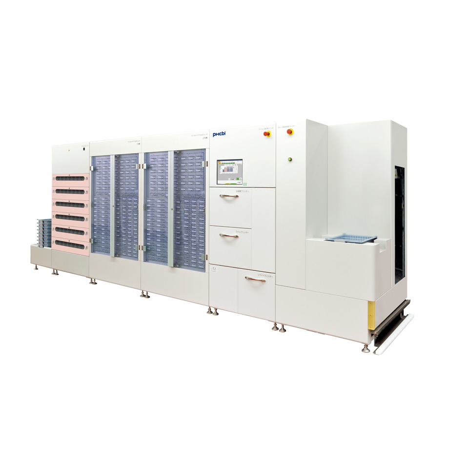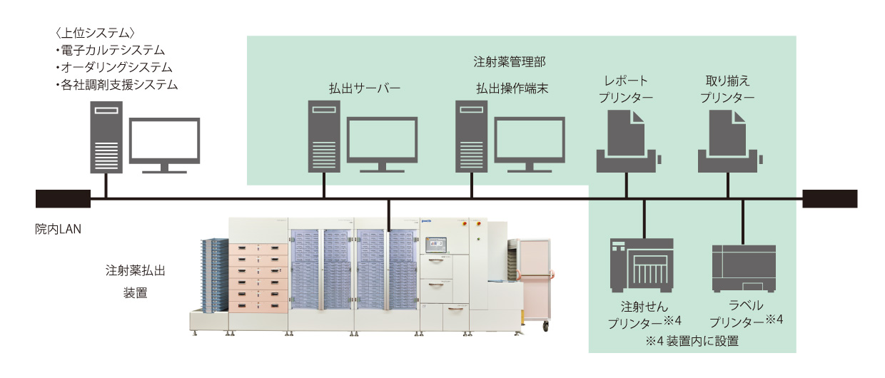上位システムからオーダーデーターを受け取り、患者様別の個人トレーに注射薬、注射せん、ラベルを高速に払い出すことが可能です。