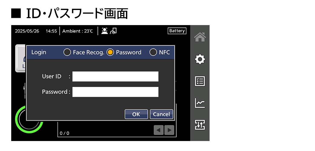 各センサー異常時、ステータスインジケータ―赤点滅、メッセージ欄にエラー表示 ブザー音断続音、遠隔警報出力、二次元バーコード表示