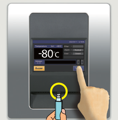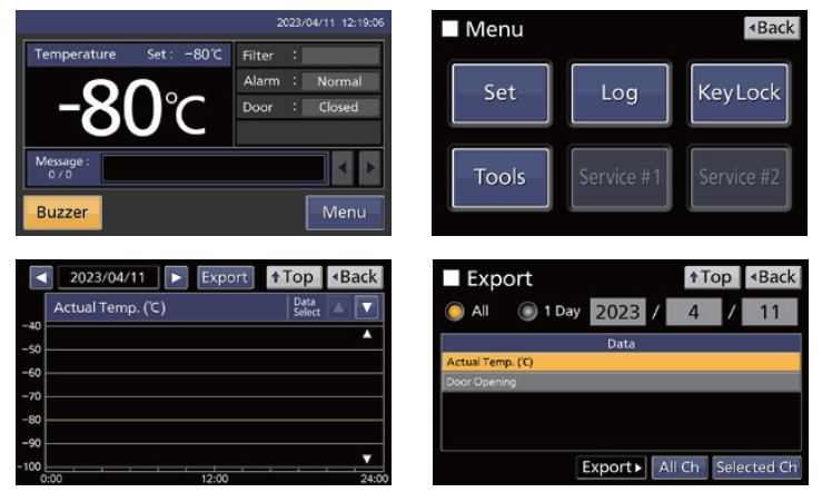 7インチフルカラー液晶タッチパネルは、グローブをしたままで操作できキーロックも標準装備。温度、扉開閉、警報の履歴を蓄積。各履歴はグラフでの表示が可能。