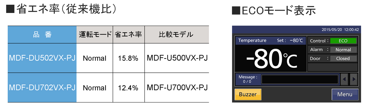 設定温度-5 ℃ ~ -40 ℃(初期設定-10 ℃) 警報設定範囲外でAlarm表示文字点滅・庫内温度表示点滅・約15 分遅延後Warning表示・ブザー断続音・遠隔警報出力