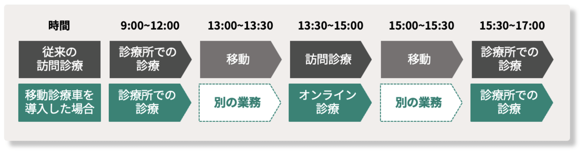 訪問診療では患者さんの通院負荷は軽減できる一方で、移動に時間を要するため、医師の限られた時間を圧迫していました。巡回診療車を活用し、現地での対応を診療看護師(NP)へタスクシフトすることで、医師の移動にかかる時間を削減し、その時間を他の業務時間にあてるなど業務効率化が可能になります。また、普段から診療で連携しているNPが現地でサポートするため、情報取得・コミュニケーションともに対面診療に近い環境での診療を実現します。