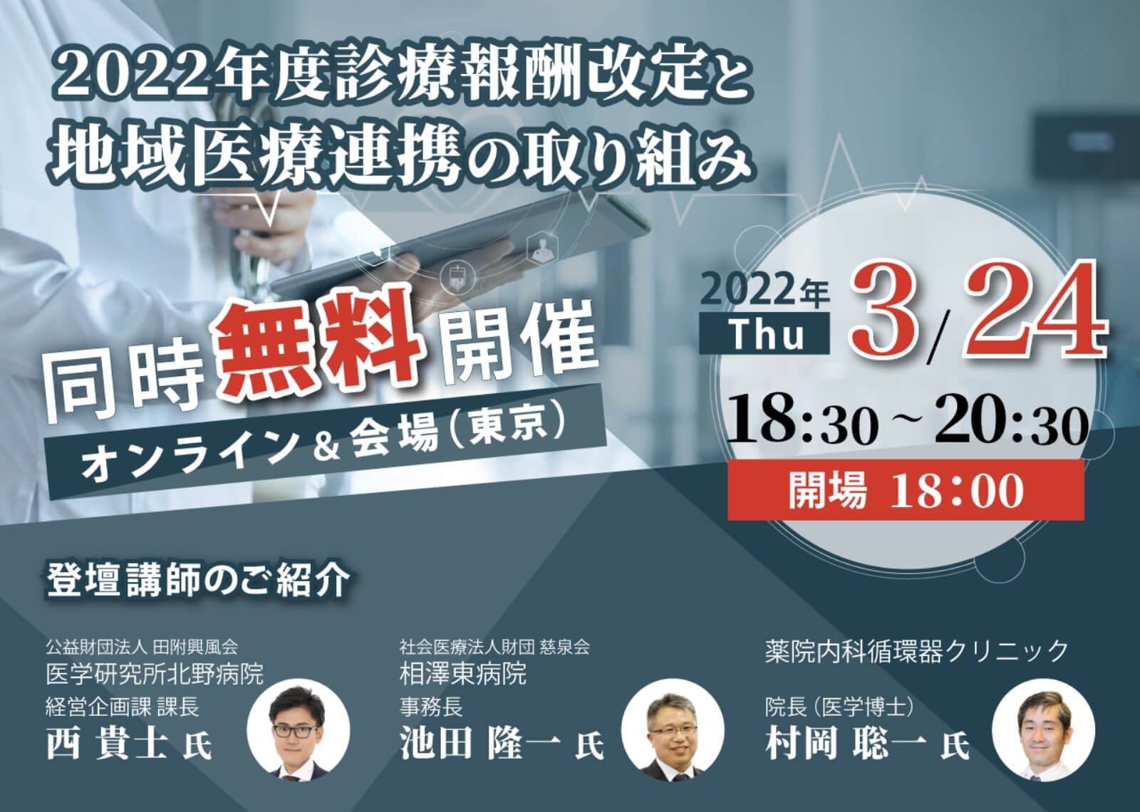 そこで今回のセミナーは「診療報酬改定」と「地域医療連携」をキーワードに「大規模病院」「中小規模病院」「クリニック」、それぞれの医療機関で実務に携わっている方にご登壇いただき、自院の立場から今回の診療報酬をどのように捉えて、将来に向けてどのような対策を考えているのかをご講演いただきます。