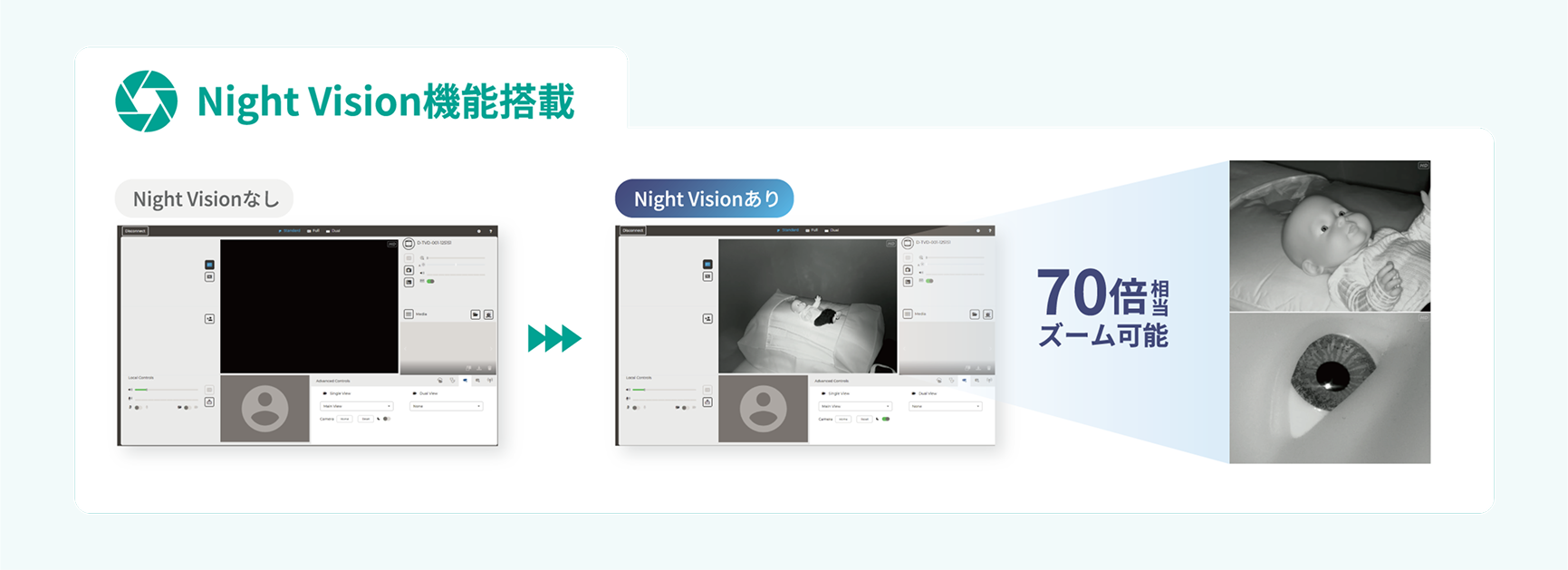 20倍光学ズーム×3.5倍デジタルズームのカメラと広角カメラを2つ搭載。また、Night Vision対応のため、暗い部屋でもより鮮明に状況を見る事が可能に。