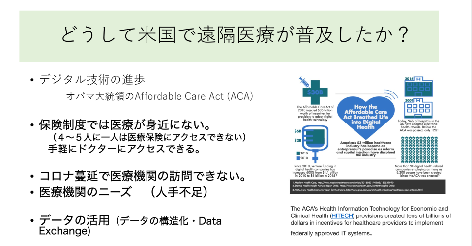 また、遠隔医療などデジタル化したツールで集められた医療データは、その後の研究・開発に使うことができます。「データを溜め込もう」という計画もあり、他国に比べてアメリカの遠隔医療が大きく進んだと、理解しています。
