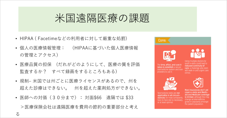 遠隔医療においては、先ほど話した「HIPPA法」の遵守は課題というよりもやらなくてはいけないことです。違反すると実刑が科せられることがあるため、医療機関はセキュリティに関してはビクビクしながら過ごしていると思います。