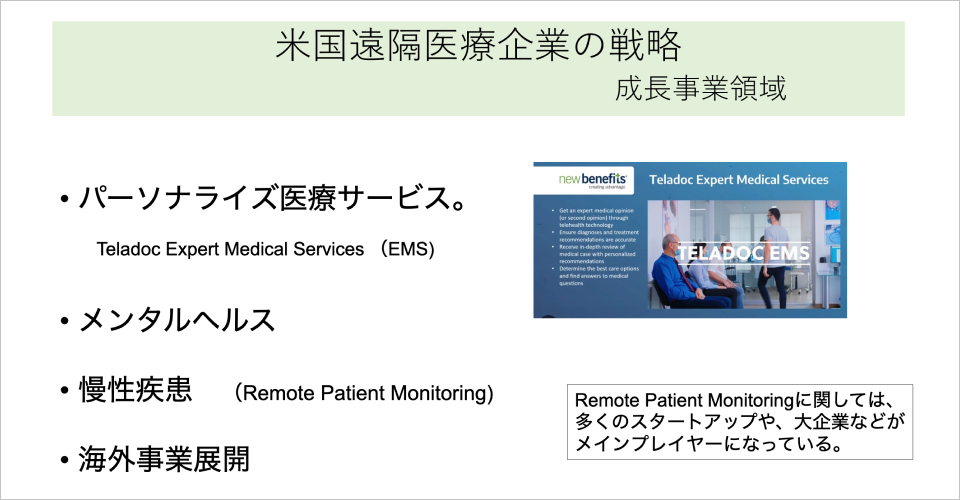 そして、メンタルヘルスと糖尿病をはじめとした慢性疾患など、この辺りでの遠隔医療が伸びていくのではないかと推測しています。
