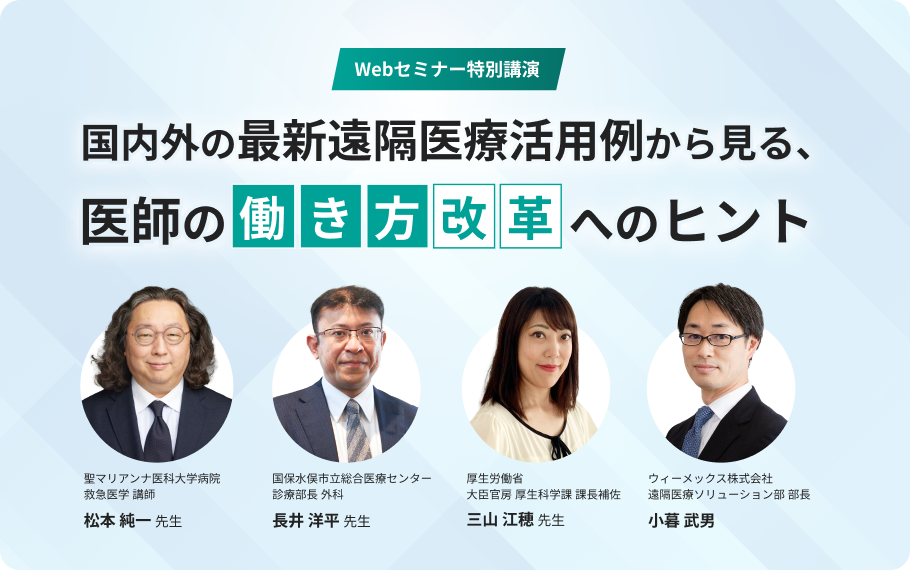 来年度から始まる「医師の働き方改革」をきっかけに医療のICT化がより進んでいくと考えられ、その手段の一つとして遠隔医療システムが注目されています。 本動画では、現場で遠隔医療の活用・実装を推進いただいている先生方にご登壇いただき、国内外の事例を通じて、遠隔医療の活用とその実装に向けた取り組み、また、今後の方向性についてご発表いただきました。