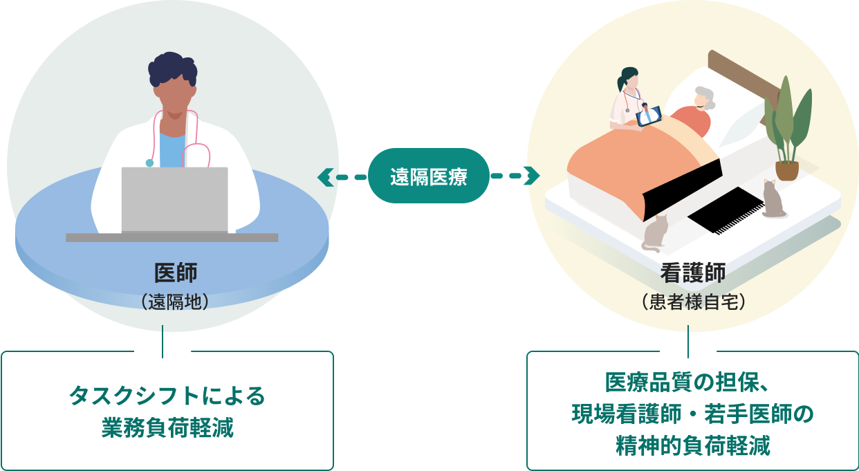 Teladoc HEALTHを使用し、医師から看護師等の医療従事者へタスクシフト/シェアを実施。遠隔地でも豊富な情報量を得られるため、医師の負担を軽減しながらも、医療の品質を確保できる仕組みを構築。