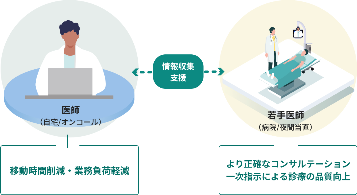 当直医の人数を制限しなければいけない場合等、遠隔から指導医がオンコールでサポートを実施。 遠隔地の医師の負担を軽減しつつ、現場の一部業務負荷・精神的負担を削減し、医療の品質を担保できる体制を構築。