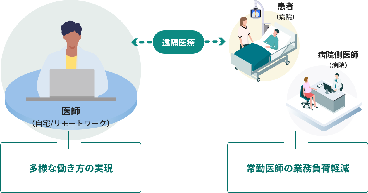 高解像度カメラや周辺機器からの豊富な情報で、どこからでも対面に近い診療を可能に。 病院でのフルタイム勤務や夜間対応が難しい医師に対し、リモートワークや時短勤務などの多様な働き方を提案。
