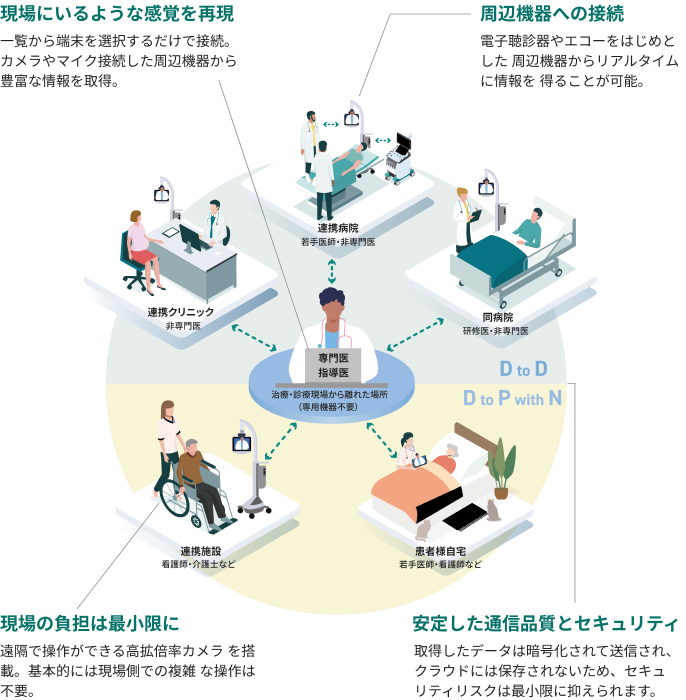 医師からのアクセスのみで接続でき、相互の接続確認なくご利用いただけます。また、カメラを遠隔の医師側から操作することができるため、現場のITリテラシーに左右されることなく、緊急性の高い場面でもご利用いただけます。