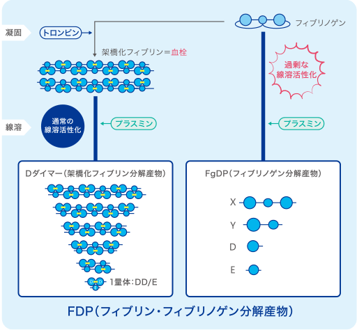 通常、架橋化フィブリン(血栓)の形成により線溶が活性化され、架橋化フィブリン分解産物(Dダイマー)が生成されます。