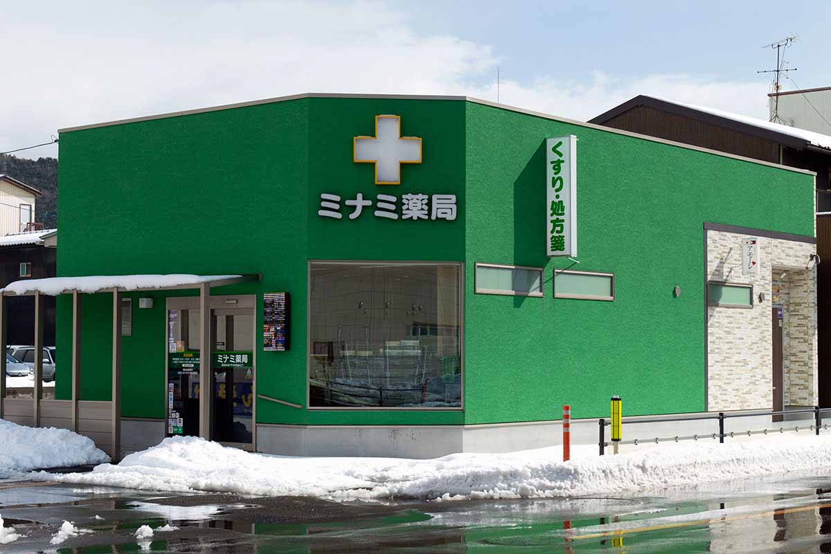 1967年の創業から50年以上、鳥取県倉吉市にて、地域住民の健康を見守り続けているミナミ薬局。2016年の鳥取県中部地震によって創業時からの店舗が半壊するという災難に見舞われましたが、その後店舗を新装。鮮やかな緑色を基調とした外観は倉吉駅前通りのシンボル的存在として親しまれています。