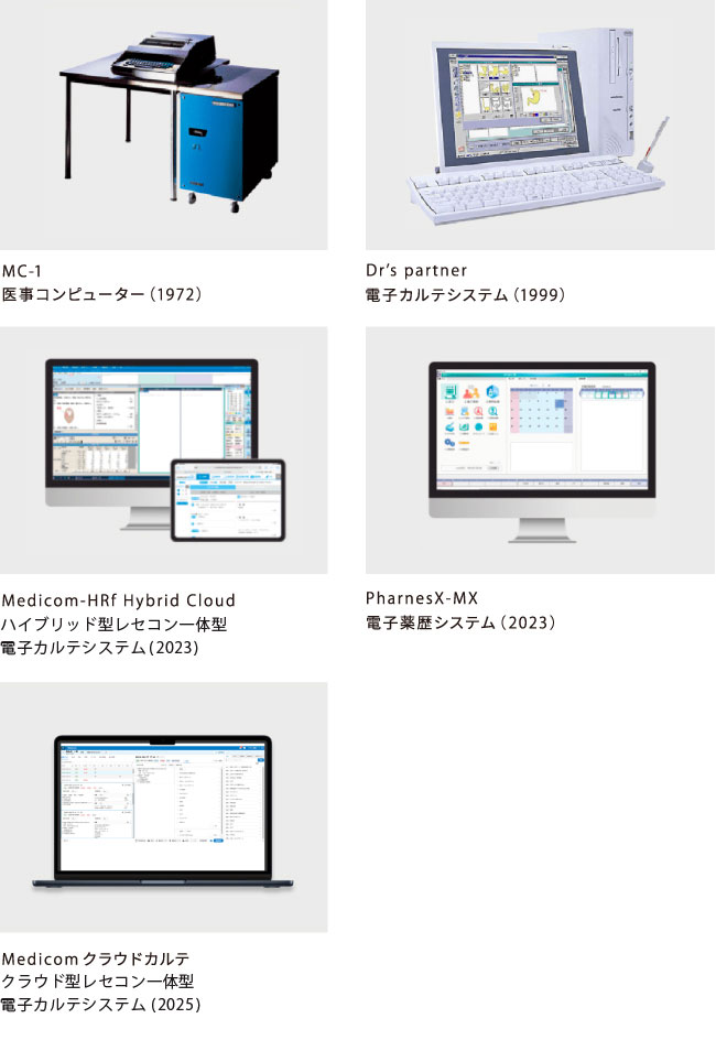 1972年に日本初の医事コンピュータ「メディコムMC-1型」を発売して以来、メディコムシリーズの医事コンピュータや電子カルテは、医療機関・保険薬局等のIT化・ネットワーク化をリードしてきました。