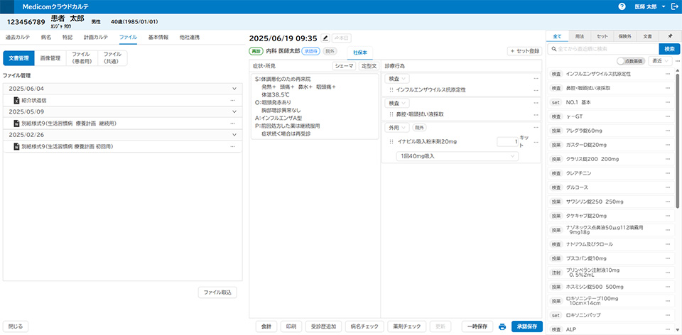 UIがわかりやすく直感的に操作でき、セット登録と定型文の2つの機能によるスピーディーな入力でカルテ記載が効率化できます。