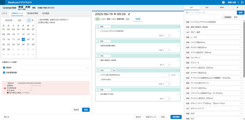 Medicom クラウドカルテでは、カルテ入力内容をもとに算定可能な項目を抽出する独自のAI自動算定機能を搭載。算定漏れを防ぎます。