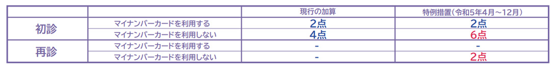 前述の施設基準を満たす保険医療機関を受診した患者さんに対し、再診を行った場合における評価の特例として、再診料(新)医療情報・システム基盤整備体制充実加算(マイナンバーカードの利用がない場合)で2点が加算されます(1回/月)