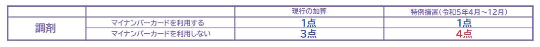 前述の施設基準を満たす保険薬局において、調剤をおこなった場合における評価の特例として、医療情報・システム基盤整備体制充実加算(マイナンバーカードの利用がない場合)が3点(6月に1回)から 4点に変更されます。